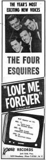 After London Records signed them in March 1956, "Look Homeward Angel" was a turntable hit, but it was eclipsed by Johnnie Ray's version. The group signs with Paris Records which will release a dozen singles. Their workmanlike "Love Me Forever' (augmented with a female session vocalist's obligato), was overshadowed by a US cover version by Eydie Gorme and one in Britain by Marion Ryan."Love Me Forever" Charted at #25 on Billboard Hot 100 in November 1957 and #23 on UK Singles chart. The Four Esquires had two other Billboard chart records, "Look Homeward Angel" (#55 in May 1956) and "Hideaway" (#21 in September 1958).
